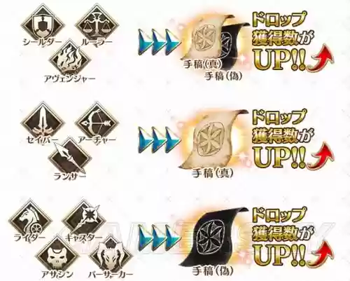 下面就一起来看fgo赝作英灵活动掉落倍卡及礼装介绍。倍卡及掉落加成礼装本期所有英灵全部都是倍卡,类似于情人节活动。图中ドロップ_得数的意思就是物品掉落数UP,即每一个英灵能使对应掉落数+下面3个为交换所的掉落倍卡礼装。