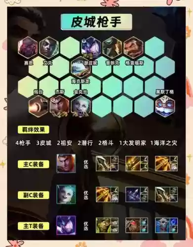 2、阵容搭配 英雄选择:战争之影—赫卡里姆、熔铁少女—芮尔、北地之怒—瑟庄妮、机械先驱—维克托、复仇焰魂—布兰德、魂锁典狱长—锤石、深海泰坦—诺提勒斯。羁绊组合:3重骑兵:获得30%伤害减免,战斗环节开始时和每次冲锋后效果翻倍,持续4秒。